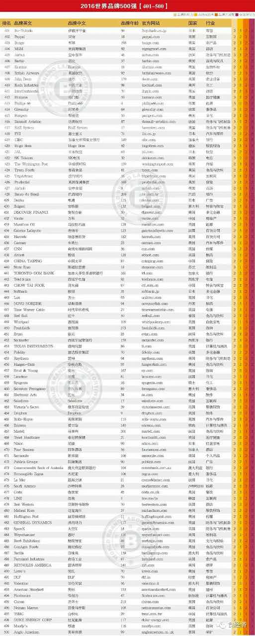 今年“世界品牌500强”共覆盖了50个行业,在排行榜覆盖的50个行业中,入选品牌最多的行业依次为食品与饮料(38个)、汽车与零件(37个)、传媒(33个)、零售(24个)、能源(23个)和互联网(22个)等。