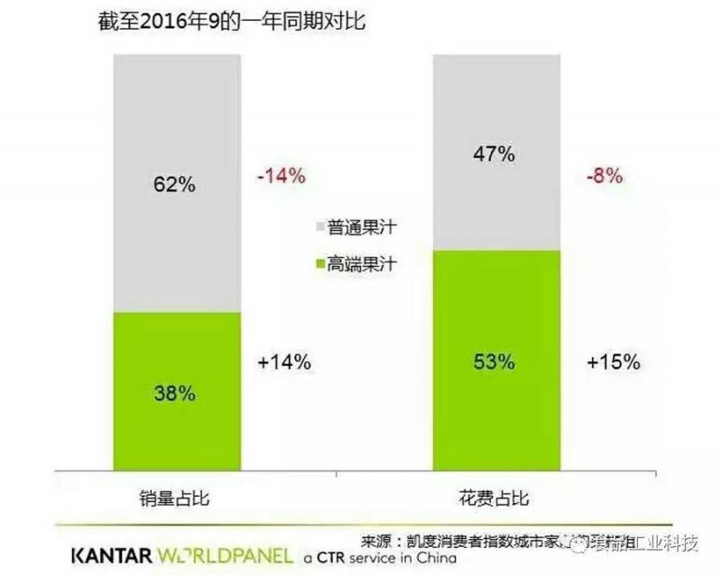 凯度消费者指数连续性城市家庭购买样组研究发现,截至2016年9月的一年,果汁市场整体销额增长不到3%。