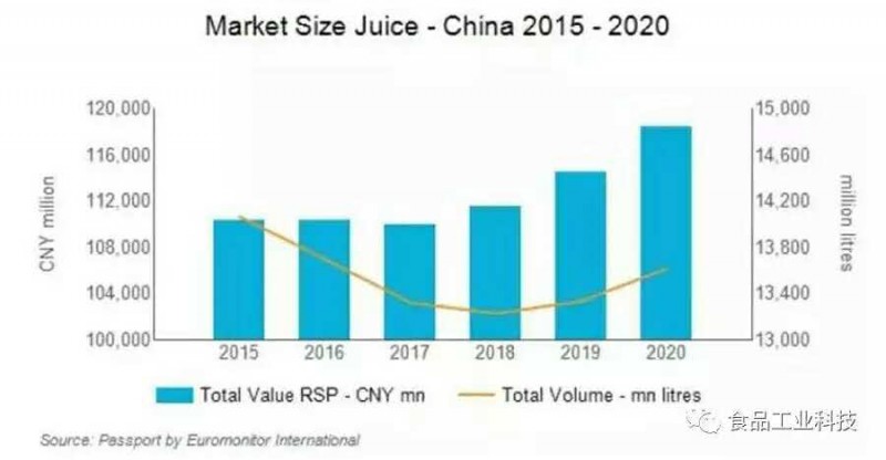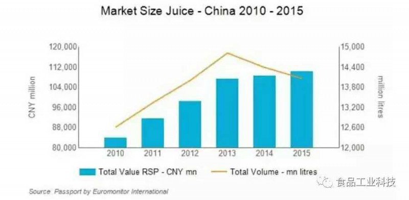 据行业权威数据,2015年中国果汁市场销售额增长1%,市场销量下降3%。2015年行业销量下降主要因素是中国市民的健康意识提高。在贸易方面,进口量优于出口量;