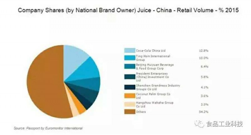 可口可乐中国有限公司保持其行业领导地位,占到13%的市场份额,相比2014略有下降,由于行业激烈竞争,以及消费者观念的改变,可口可乐公司产品线的整体下滑,也导致了果汁有所下滑,果汁约占到其饮料的24%。