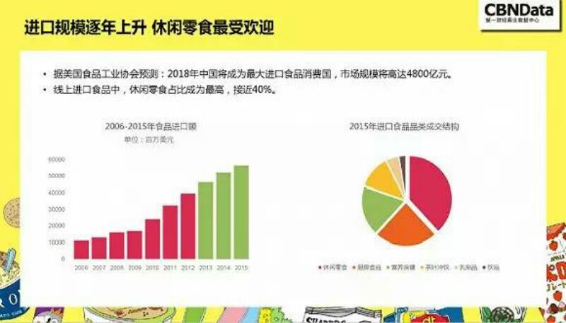 按美国食品工业协会预测,到2018年,中国将吃掉4800亿元的进口食品,位居全球第一。第一财经商业数据中心指出,目前进口休闲零食销售额占到了线上进口食品的40%,2012年-2015年平均增长率超过80%,远高于其它品类。