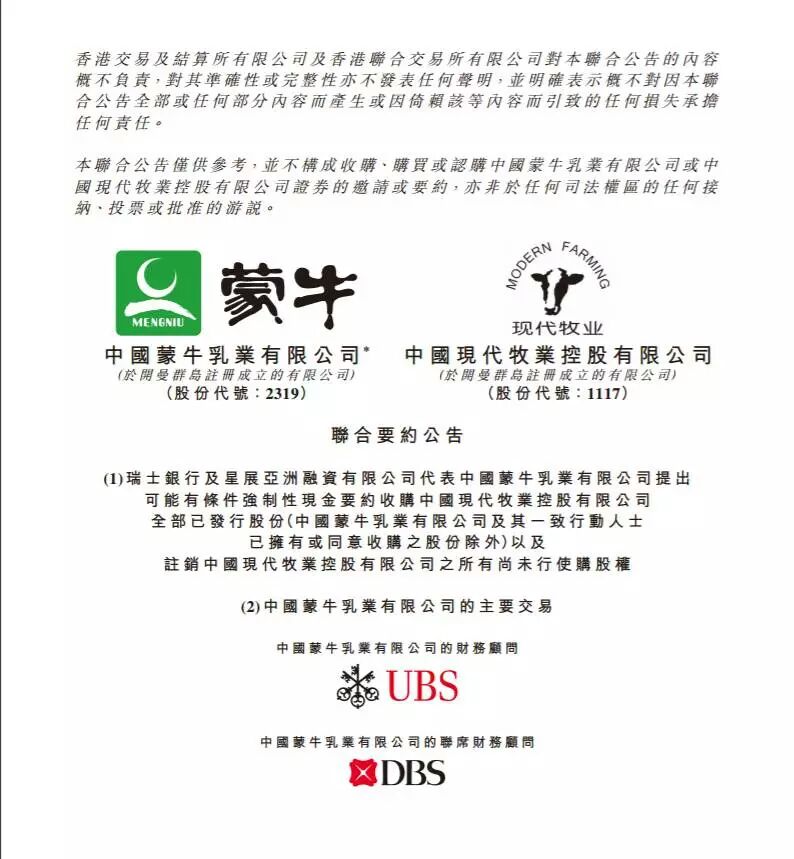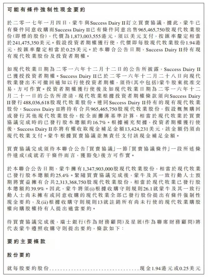 今天清晨,蒙牛乳业(02319.HK)和现代牧业(01117.HK)在港交所联合发布要约公告,披露昨天蒙牛与Success Dairy II订立买卖协议,蒙牛将以每股1.94港元的价格,收购16.7%的现代牧业股份。交易总金额约18.73亿港元。