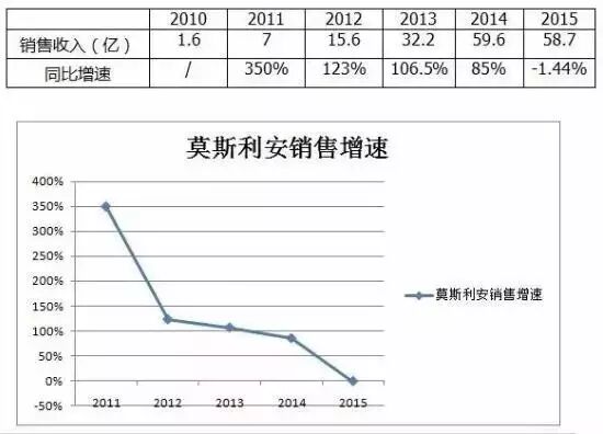 公开资料显示,莫斯利安在2011年至2014年4年销售收入同比增长分别为350%、123%、106.5%和85%。