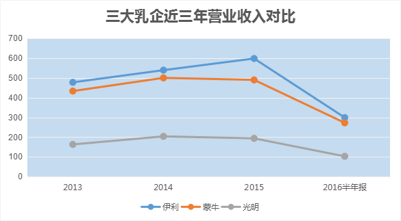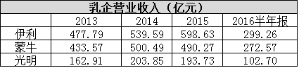 光明乳业未能在过去中国乳业发展的黄金十年里得以迅速扩张。导致多年来,光明乳业规模渐渐与蒙牛、伊利拉大距离。2016年上半年,光明乳业的营收为102亿元,而伊利和蒙牛同期分别实现299亿元和272亿元,对比差距近200亿元。