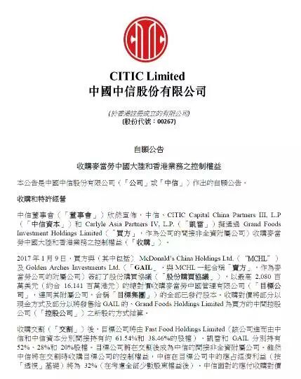 中信股份也午间在港交所挂出公告,表明已经获得了麦当劳中港业务的控制权益。