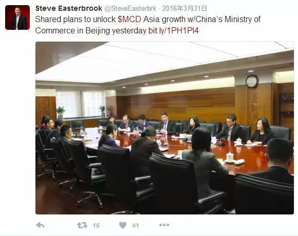 小编翻看他的推特,发现在去年3月31日就曾经发出一个帖子,称在前一天于北京和中国商务部“分享释放麦当劳亚洲和中国增长的计划”。不久,麦当劳就对外宣布了要找要为中国市场找战略投资者的想法。