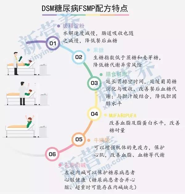 根据以上技术要求,帝斯曼糖尿病病人用全营养配方食品配方不仅提供了全营养支持,还具有辅助控糖,降低糖尿病并发症风险的特点。主要营养素成分有缓释淀粉、果糖、膳食纤维、MUFA、PUFA、牛磺酸、左旋肉碱等。