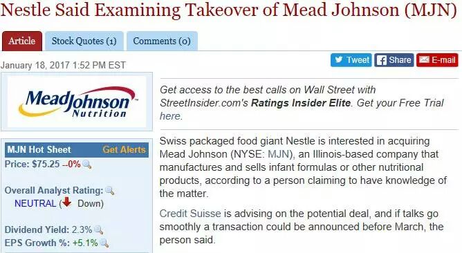 昨夜今晨,美国知名的金融新闻和分析服务网站Streetinsider.com引述一位声称“直接知道事件”的消息人士称,雀巢有兴趣收购美赞臣,目前瑞信正在作为这起潜在交易的顾问,一旦谈判进展顺利,该交易将在今年3月前正式宣布。