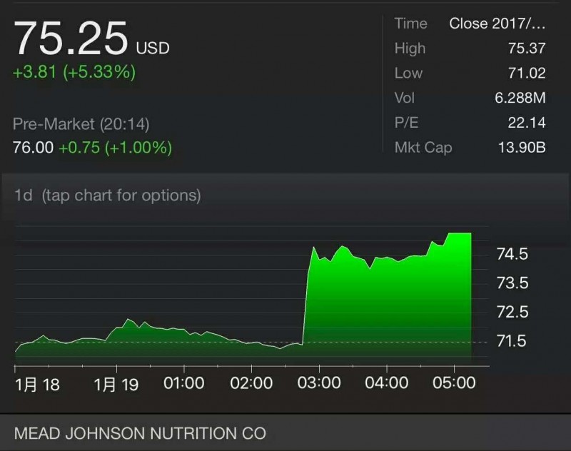 报道说,雀巢的一位代表接受查询时表示不会评论市场传言,而美赞臣则未回复该网站的查询。不过,受到消息影响,美国当地时间昨日美赞臣的股价应声上涨了5%。