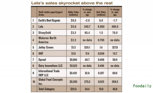 IRI的数据指出,常温酸奶和饮用酸奶的销售额增加了54.4%,达到了2550万美元;单位产品销售额增加了40.8%,达到了1300万美元。虽然这个品类相对比较小,但显示出巨大的增长。Mintel最新的研究指出,从2011年到2016年,饮用型酸奶的销售额增加了62%,预计在2016年还会增加11%。