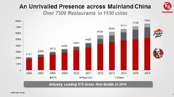 潘伟奇今天在分析师会议上指出,2016年对于百胜中国来说是历史性的一年,去年公司分拆后在纽交所挂牌上市,成为中国最大的餐饮公众公司。此外,公司新开门店575家,升级改造了791家。