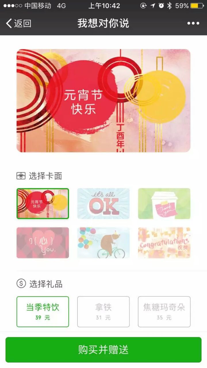 刘文娟用“简洁却不简单”来形容“用星说”这款星巴克中国区独有的全新社交礼品。她说:“'用星说'比微信原有的卡券体验不一样,购买的过程更方便、流畅;有丰富卡面可供选择,更具个性化化;而收礼人在收到礼品后,点击打开会即会看到对方的定制心意。”