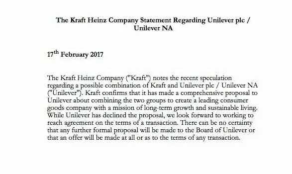 卡夫亨氏公示注意到最近有关卡夫和联合利华可能合并的传言。卡夫确认,公司向联合利华提出了一个全面建议,该建议提议合并两个集团以缔造一个领先的、以长期增长和可持续生活为使命的消费品公司。尽管联合利华已经拒绝了提议,我们依然期望能一起合作就交易达成协议。并不保证会向联合利华董事会提出下一步的正式提议,也不保证会达成任何交易协议。
