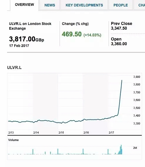 虽然以上声明表示联合利华拒绝了,但是受到消息刺激,联合利华的股价目前上涨到了历史新高,先是从33.60英镑大幅跳涨到37英镑或涨幅11%,目前已经涨幅超过14%。这样一来,联合利华的市值超过了1000亿英镑。
