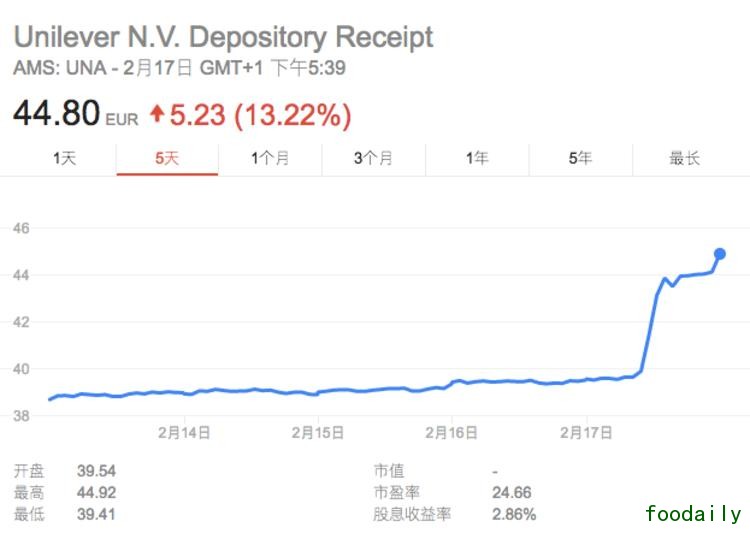 无论如何,资本市场看起来都很期待这次并购。在消息出来之后,联合利华在伦敦的股价上涨了 12.2%,而卡夫亨氏在纽约的股价则上升了 7.3%。