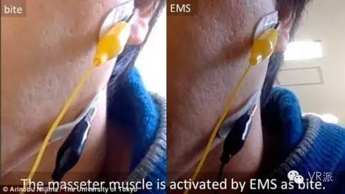 目前,东京大学的一支研究团队正在寻求如何让人们在虚拟现实中感受到更多的软硬、嚼劲等,他们正在试验通过在脸部安装电极的方法,打算利用电流刺激下颚来达到研究目的。研究人员Arinobu Niijima和Takefumi Ogawa表示,微弱的肌肉电刺激(EMS)能够模拟人们咀嚼时下颚的肌肉运动,通过这种方法,即使用户的口中没有食物,通过嘴巴的张合也可以体会到不同食物的口感。研究发现,100-250赫兹的短脉冲刺激肌肉时,会让虚拟食物更加具体化,同时人们会觉得自己在咀嚼固体食物。而且高频率的短脉冲还会让人们觉得在咀嚼具有弹性的食物。
