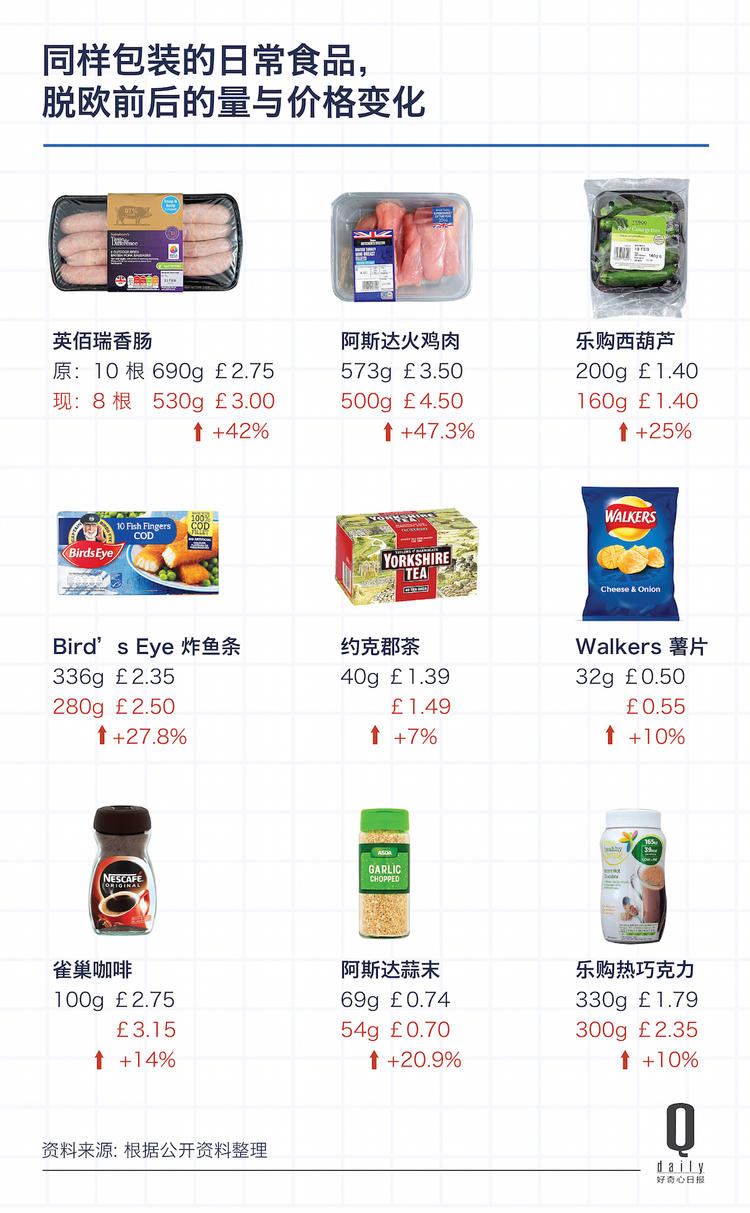 英国电视台 Channel 4 总结了至少 25 种涨价的日常食品,从蔬菜到肉类,从果汁到热巧克力,农产品、酒类、包装食品,无一例外。有的公司直接提价,有的公司则在保持原价的同时缩减了食品分量(称“shrinkflation”,即通过减量以变相提价)。
