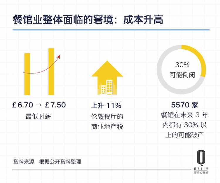 加薪意味着成本的上升。即便是那些不缺人的餐馆,也面临着这项支出——英国政府刚刚把最低时薪从 6.7 英镑提升到了 7.5 磅。多出的成本势必要反应到价格上,而英国的家庭平均可支配收入却没怎么变化,去年仅仅增加了 0.5%。根据《卫报》的报道,通胀压力和停滞的可支配收入,将会让 5570 家餐厅在未来 3 年内的破产概率达到 30% 以上。