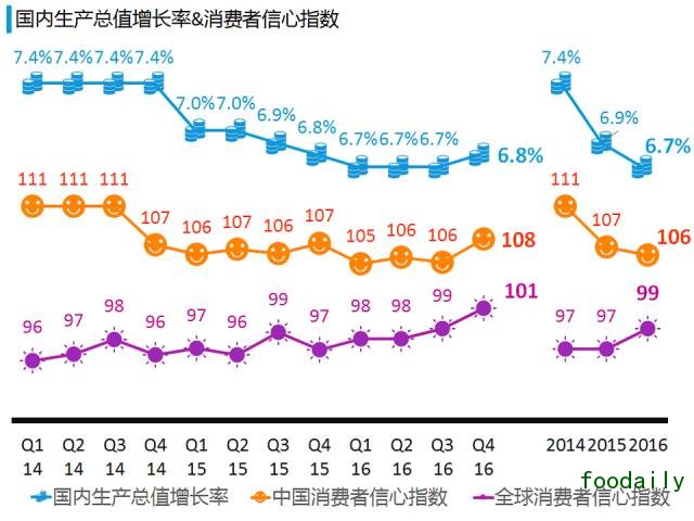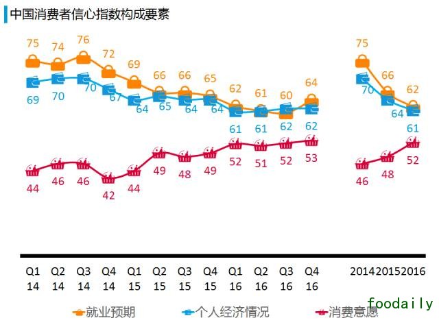 在经历了连续三个季度的平稳后,中国消费者信心指数在2016年第四季度增长明显,从第三季度的106点上升至108点。纵观2016年全年,各季度消费者信心指数稳定在105-108区间,表现为稳中向好的态势,表明中国消费者信心在刚刚过去的一年里积极乐观。