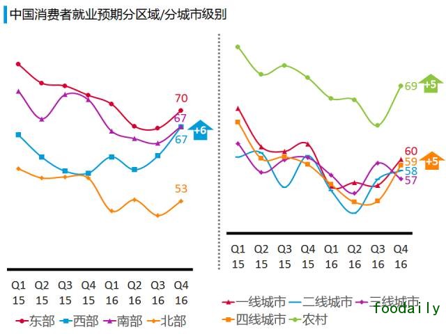 尼尔森报告显示中国各地区的就业预期在第四季度普遍上涨,东西南北四个区域的消费者均对未来就业形势普遍感到乐观,呈现出该数值在四个区域均较上季度明显上升,尤为明显的是西部地区,从三季度的61飙升至67。从城市级别来看,四线城市和农村居民对就业形势最为乐观,分别上升5点至69和59。