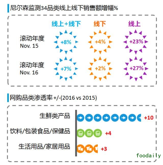 尼尔森报告显示,随着居民生活水平的提高,中国消费者越来越享受更加便利的生活,这一需求促使日常网购的增加,以及便利店的高增长。数据显示,生鲜类产品在2016年是消费者网购增长最快的品类,2016年该品类较上一年上涨了10个百分点,紧随其后的是饮料/包装食品/保健品品类,上涨了4个百分点。生活用品,服务类产品,衣帽服饰,个人护理等品类的网购也较上一年有所上涨。