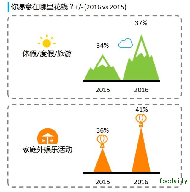 在消费升级的大背景下,消费者需要被满足的不仅是对更高的产品质量和购物体验的需求,还有精神层面对休闲娱乐的需求,这一趋势使得旅游成为过去一年的新风尚。尼尔森数据显示,2016年有37%的受访者表示愿意在外出旅游度假上消费,这一数字相比2015年上涨了3%。与此同时,有41%的受访者表示愿意在家庭外的娱乐活动上消费,而这一数字在2015年仅为36%。