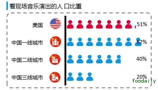 相比之下,中国一线城市的居民相较于其他地区居民有更多的对于追求精神文化享受的需求,去年中国一线城市中有57%的居民观看过现场音乐演出,这一数字甚至高出了美国51%的平均水平。中国二线城市也有40%的居民观看过现场音乐表演。