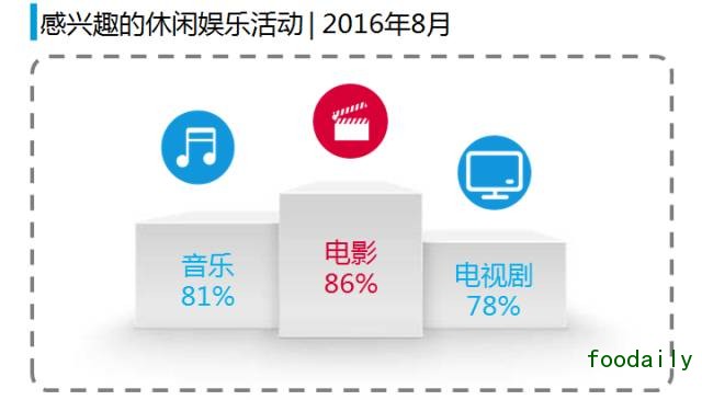 尼尔森研究发现,观看电影是最受中国消费者喜爱的娱乐消遣方式,有86%的受访者选择看电影为自己最感兴趣的休闲娱乐活动,紧随其后的是听音乐(81%)和看电视剧(78%)。