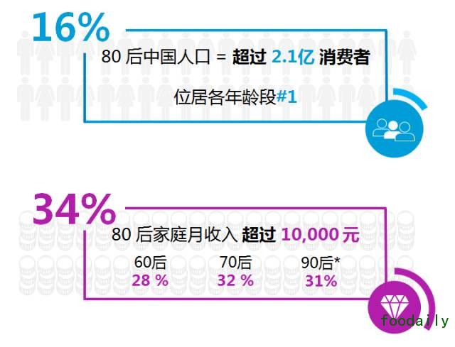随着步入2017年,80后群体的年龄段已经从最年轻的27岁到最大的37岁。他们中的大多数人已经30而立,成为了社会发展的中坚力量。尼尔森研究发现,随着经济实力变强,80后群体已经成为消费主力军,数据显示,全国有2.1亿的消费者是80后人群,位列各年龄段之首,占全国消费者总数的16%。