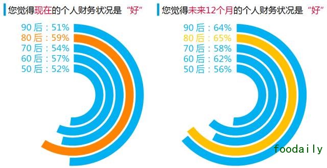 较好的经济状况也使得80后消费者对自己的财物状况更加乐观,具有相比各年龄段人群更强的消费力。相较于50后至90后各年龄段的人群,80后消费者对自己的经济状况最为乐观,有59%的80后受访者认为自己现阶段的财物状况良好,领先于60后的57%,70后的54%,50后的52%,90后的51%。与此同时,有65%的80后受访者对自己未来12个月的财物状况表示看好,高于90后一个百分点,遥遥领先于70后的58%。