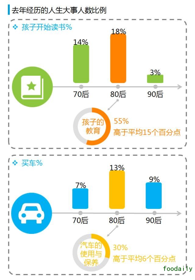 80后大多已经成家立业,所以为家庭的支出占据了80后消费的主要部分。孩子的读书教育消费占到了80后消费者总消费的55%,远远高于各年龄段人群教育消费40%的平均值。同时,购置新车与保养车辆也占据了80后消费的很大一部分,有30%的开销被80后家庭用于此项,仍旧远高于各年龄段24%的平均值,尼尔森数据显示,有13%的80后家庭拥有私家车,高于70后的7%与90后的9%。同时,80后还是热衷于休闲娱乐的人群,他们中有44%的受访者表示会家庭外出娱乐,高于各年龄段均值4个百分点。