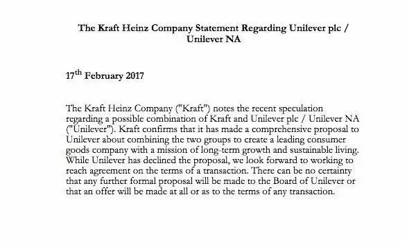 2月16日,美国食品公司卡夫亨氏确认自己对于英国食品和日化公司联合利华发出了合并邀约。卡夫亨氏对联合利华提出的收购价格是每股50美元,对其估值为1430亿美元,但遭到了后者的拒绝。