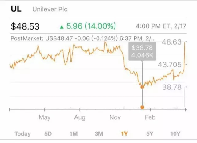 对于全球食品和快消巨头来说,近两年是一段非常难熬的时光。今年1月,联合利华的股价曾跌至38.78美元,是过去一年的最低点。但这对于收购方来说却是一个好消息。