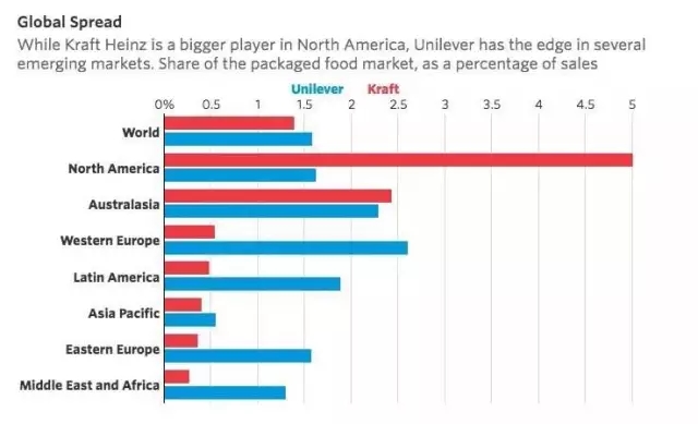 从销售区域来看,这两者也能互补。同样是对照《华尔街日报》整理的数据,卡夫亨氏在北美有着市场优势,而联合利华在澳大利亚、欧洲、南美和中东,具有市场优势。