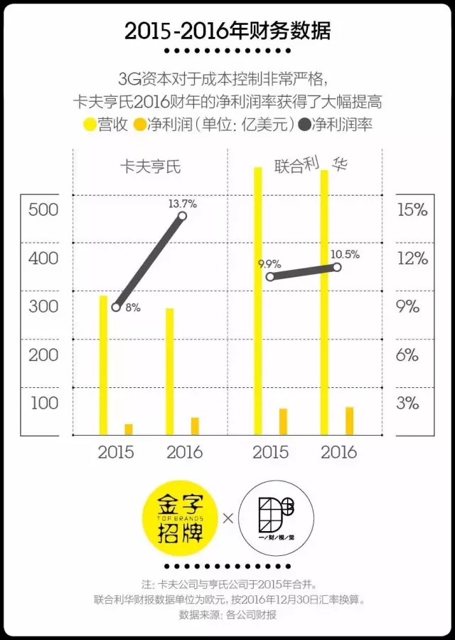 2015年,在3G资本和巴菲特的主导下,卡夫和亨氏两家公司合并。卡夫亨氏当年的净利润率为8%,低于联合利华的10%。但是在短短的一年之后,卡夫亨氏在营收规模下降了9%的情况下,净利润率反而增长了5.7%,达到了13.7%,超过了联合利华当年的10.5%。