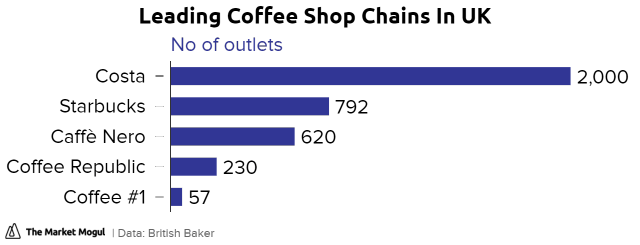 我们刚刚提到,咖啡产业链上游多以小散个人或组织为主,而在消费终端亦是如此,终端市场如今被极大咖啡巨头所垄断,例如在英国,Costa、星巴克和CaffèNero三大家的分店总数达到了3,412家,而紧跟其后的Coffee Republic分店数仅为230家。
