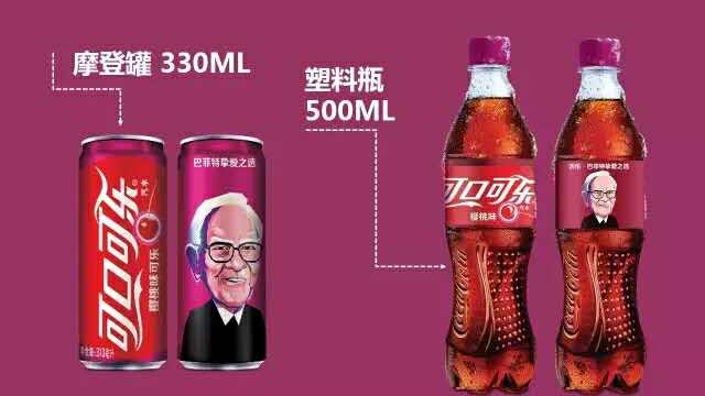 据悉,樱桃味可口可乐将推出330ml摩登罐和500ml塑料瓶两种规格。值得一提的是,股神巴菲特的漫画头像还将出现在包装上。