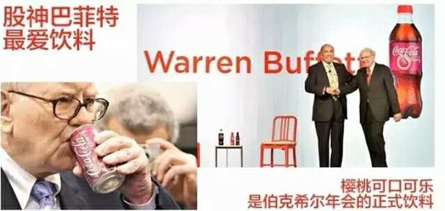 股神巴菲特是樱桃味可口可乐的忠实粉丝,他每天都会喝樱桃味可口可乐,甚至把它作为伯克希尔年会的正式饮料。听说,巴菲特在得知樱桃味可口可乐在中国上市的计划后,欣然接受将自己的漫画头像印到产品包装上。