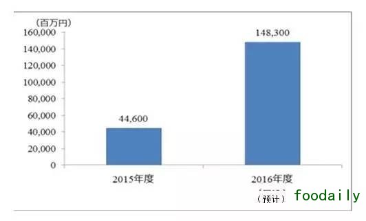 日本的功能性标示食品主要以补充剂、加工食品和生鲜食品为对象,“调理肠胃”、“缓和脂肪吸收”等功能获得消费者厅认可的产品。在该制度发轫的2015年其市场规模只有446亿日元,随着获批产品的正式出售,预计在2016年的市场规模已达到1483亿日元。