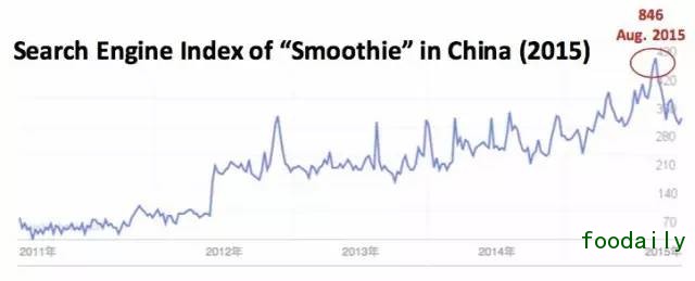 中国人接受它吗?要回答这个问题,首先要了解中国人的水果摄入情况。世界卫生组织建议每人每天摄入至少5种水果及蔬菜,且不少于400克。而据中国卫计委的数据,中国人的日均水果摄入量为40克,只相当于建议值的1/10。近年来,随着中国人的消费水平的提升,水果类产品的需求量也在提升。国内最大的中文搜索引擎百度的搜索指数显示,自2011年以来人们对于果昔产品的搜索量持续增长,并于2015年8月达到顶峰(该统计截止于2015年底)。