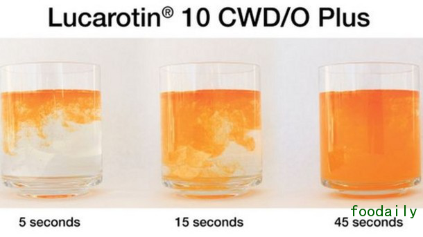 基于应用范围以及用量,生产商在使用Lucarotin 10 CWD(冷水扩散)/O(桔色)Plus时,要表明维生素A或抗氧化剂标签声明,这是一款β胡萝卜素含量达到10%的粉剂,在美国可以被标为“β胡萝卜素着色剂”。