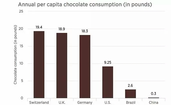 (中国年人均巧克力消费量和瑞士、英国、德国、美国和巴西相比:CNBC,Mintel)