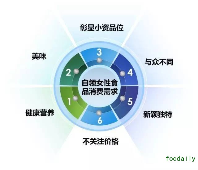 在食品方面的选择和消费上,白领追求更加健康并且体现其品味的食品。而白领女性白领在食品消费方面有更丰富的需求,如:希望通过购买创新性或者与众不同的食品来彰显其个性,一般不会受到产品价格的影响,呈现情绪化的冲动型消费倾向等特征。同时白领女性对于创新产品的多样性和更新频率要求更高。