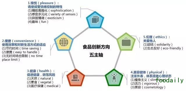 2015年,第十六届中国国际食品和饮料展览会(SIAL CHINA 2015)上展览了各国的创新性食品。从创新方向来看,食品的创新主要分:愉悦,健康,保健,便捷和伦理五个主轴,主轴下各自有3-4个趋势。
