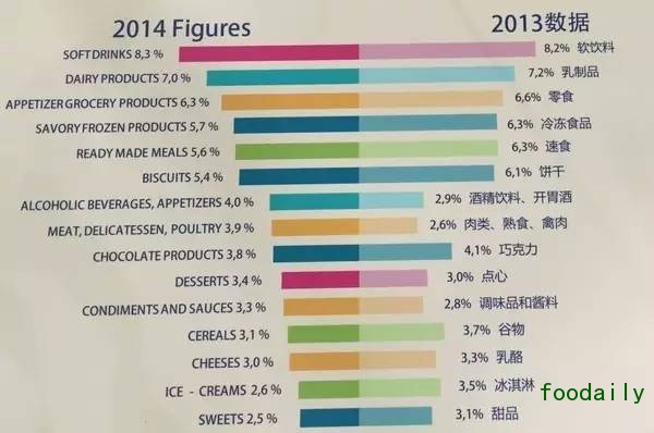 创新食品品类中,软饮料始终是全球最富创新性的产品类别,乳制品和零食分列二三位。值得注意的是,酒精饮料/开胃酒产品的供货量从2013年的2.9%上升至2014年的4%。