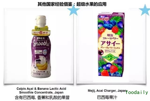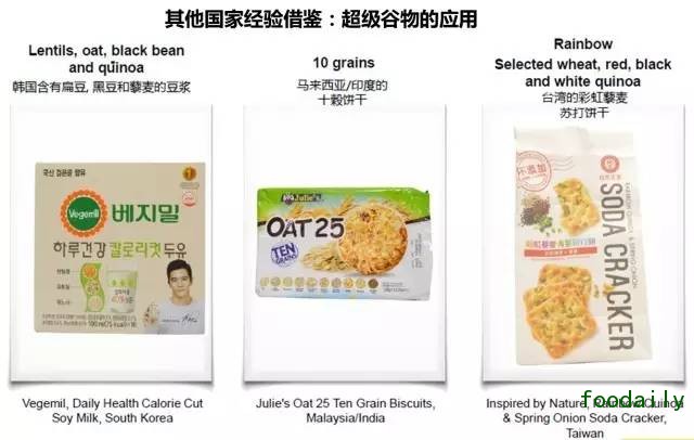 在2014年到2015年间,新上市的含有奇亚籽的食品和饮料增长了近70%,而含有藜麦的食品和饮料则增长了27%;而亚洲其他国家对于超级食品的开发也逐渐加快脚步并已经取得长足成效。比如:日本生产的巴西莓、香蕉乳酸奶昔,巴西莓果汁,马来西亚的十谷饼干,台湾的彩虹藜麦苏打饼干等。