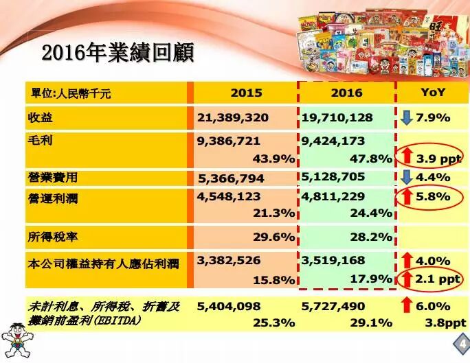 财报显示,2016年旺旺总收益为197.101亿人民币,较2015年衰退7.9%。净利润较2015年增长4.0%达到35.192亿人民币,净利润率为17.9%。米果类产品收益较2015年成长4.6%,达到54.494亿人民币;乳品及饮料类收益较2015年衰退13.4%;休闲食品类收益则主要受累于天气对冰品小类的影响,较2015年衰退8.6%。