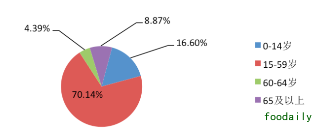 根据国家统计局在2011年发布的“第六次全国人口普查主要数据”显示:0-14岁人口占16.60%;60岁及以上人口占13.26%,其中65岁及以上人口占8.87%。