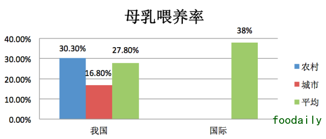 国家卫计委2014年公布的数据显示,我国的母乳喂养率呈持续下降趋势,16年间下降了近40%。0—6月龄婴儿纯母乳喂养率为27.8%,其中农村为30.3%,城市仅为16.8%,远低于国际平均水平(38%)。