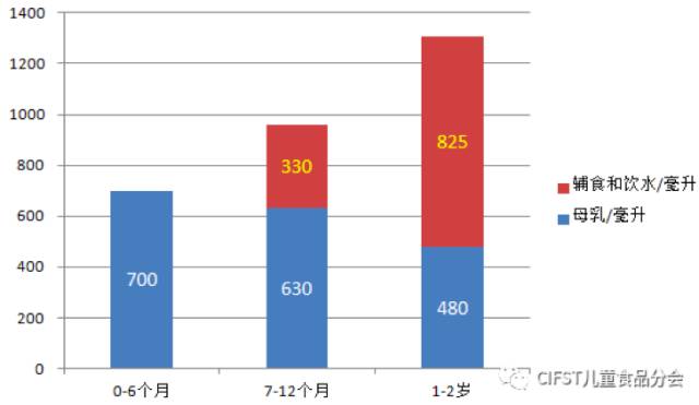 (2)对于7至12月龄的婴儿来说,每天母乳的平均摄入量约为630毫升,辅食添加及饮品补充所提供的饮水摄入量应在330毫升左右。